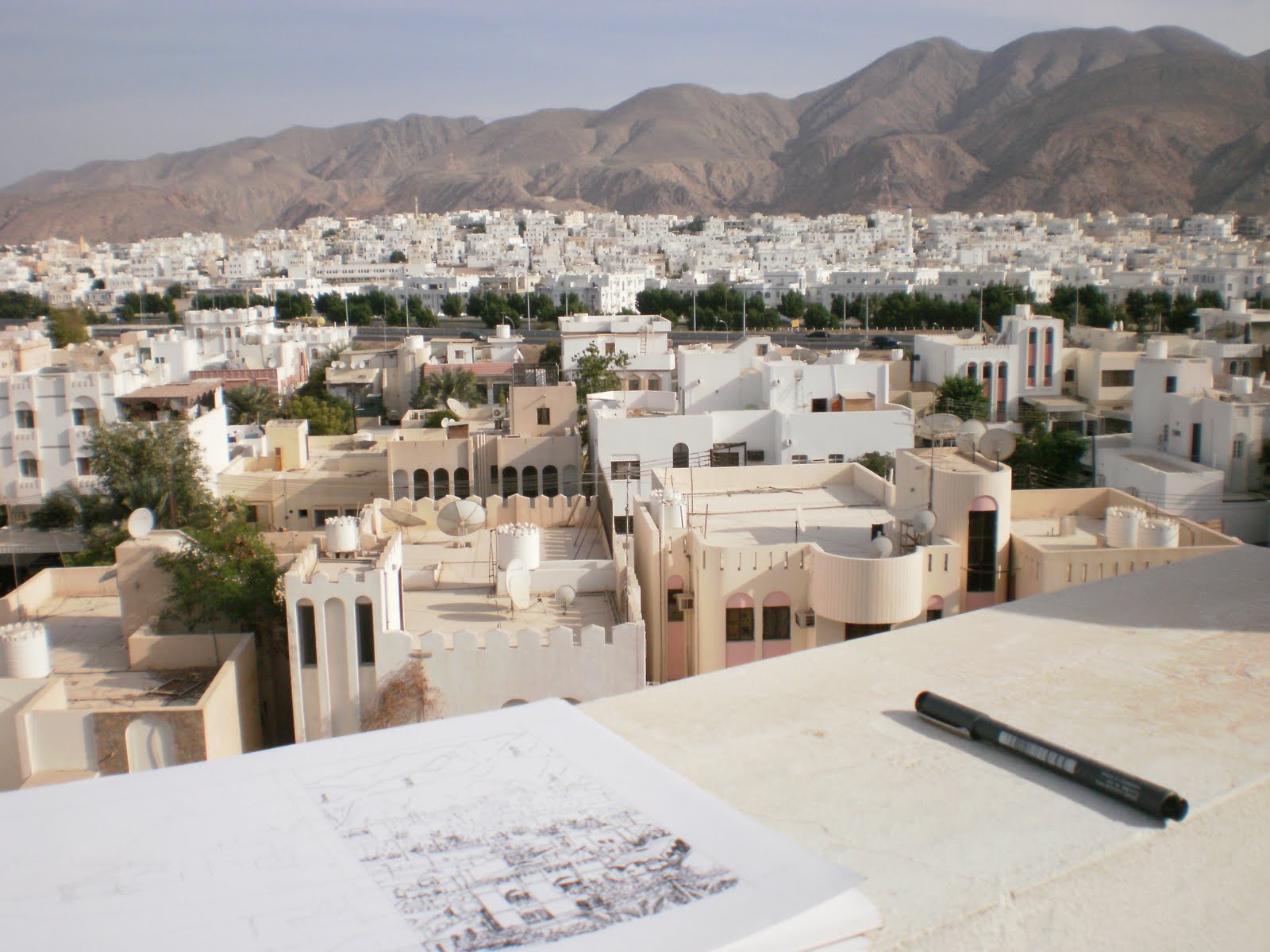 I have been meaning to draw this fort for a long time, especially as I used to live around the corner from it, and was inspired to do so by the theme. It is built of adobe brinks & sand, on sand. I guess that's why it is disappearing. I sat in my car on this warm, sticky day (around 28c with 70% humidity) giving myself the odd blast of AC, which I don't like to do as I try to be as environmental friendly as possible. The village is to the left of the fort, as can just be seen in the photo below, whereas in-front of, and to the right is waste ground and a date plantation. As normal in Muscat, it stands against a background of mountains.